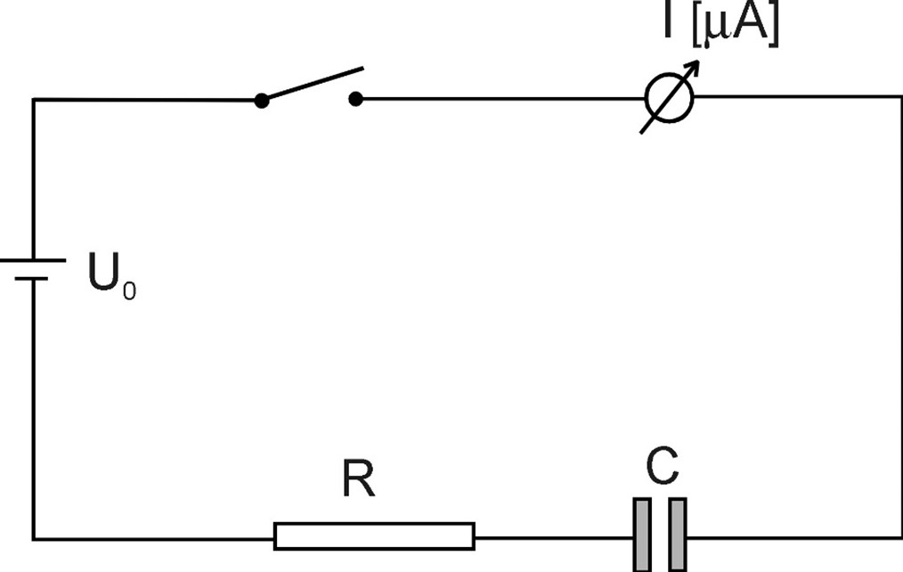 eine Spannungs- quelle U0 und ein ohmscher Widerstand R. Die Bauelemente