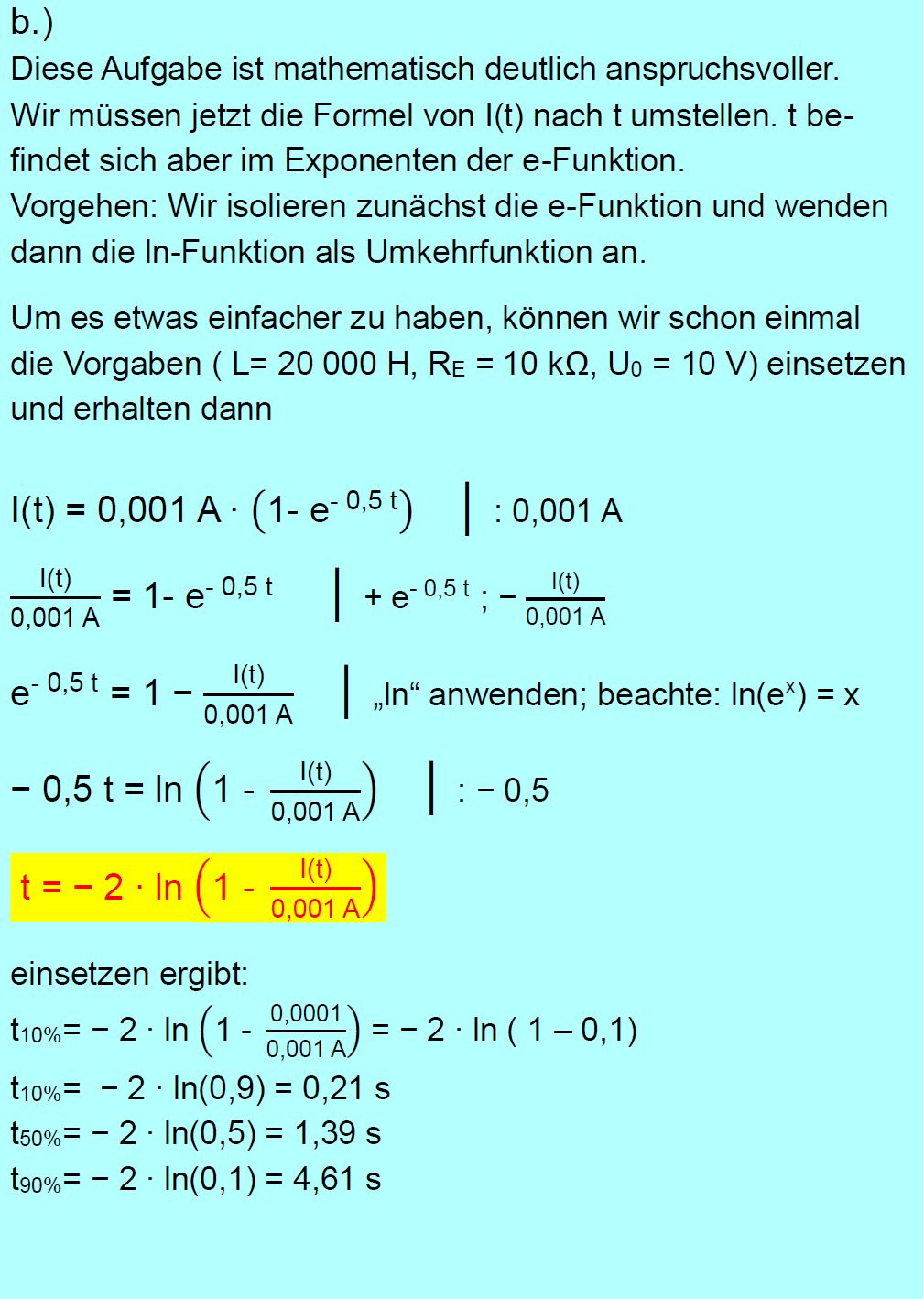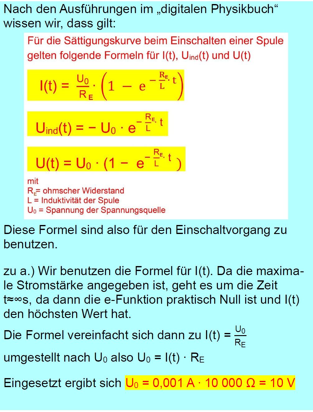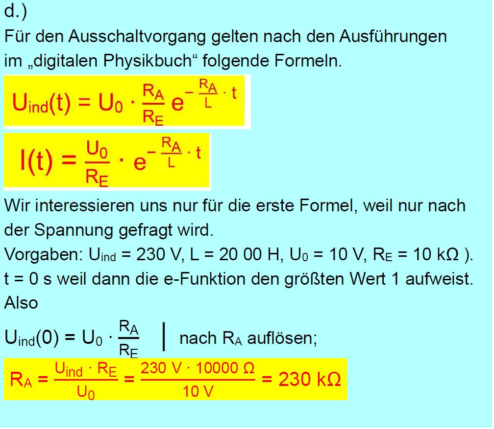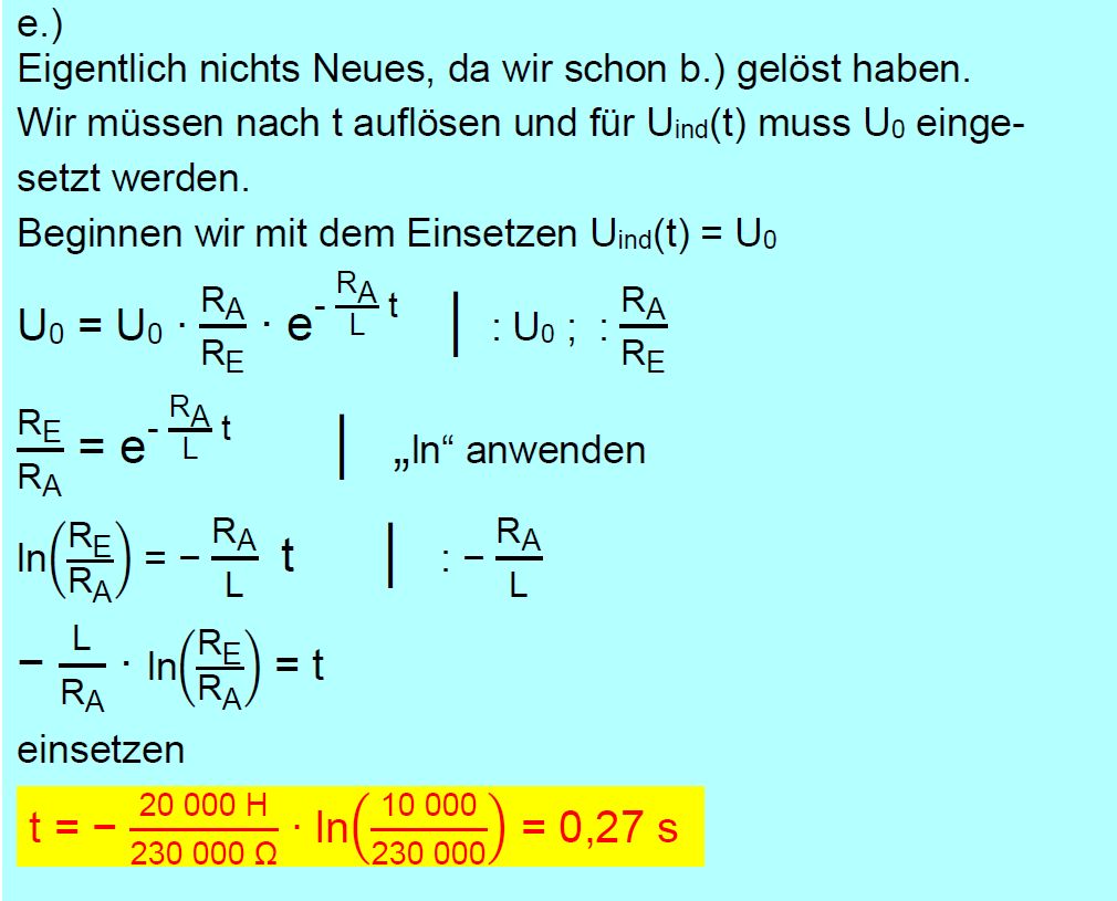 Vorgaben ( L = 20 000 H, U0 = 10 V, RE = 10 kΩ ). e.) Nach welcher Zeit (seit dem
