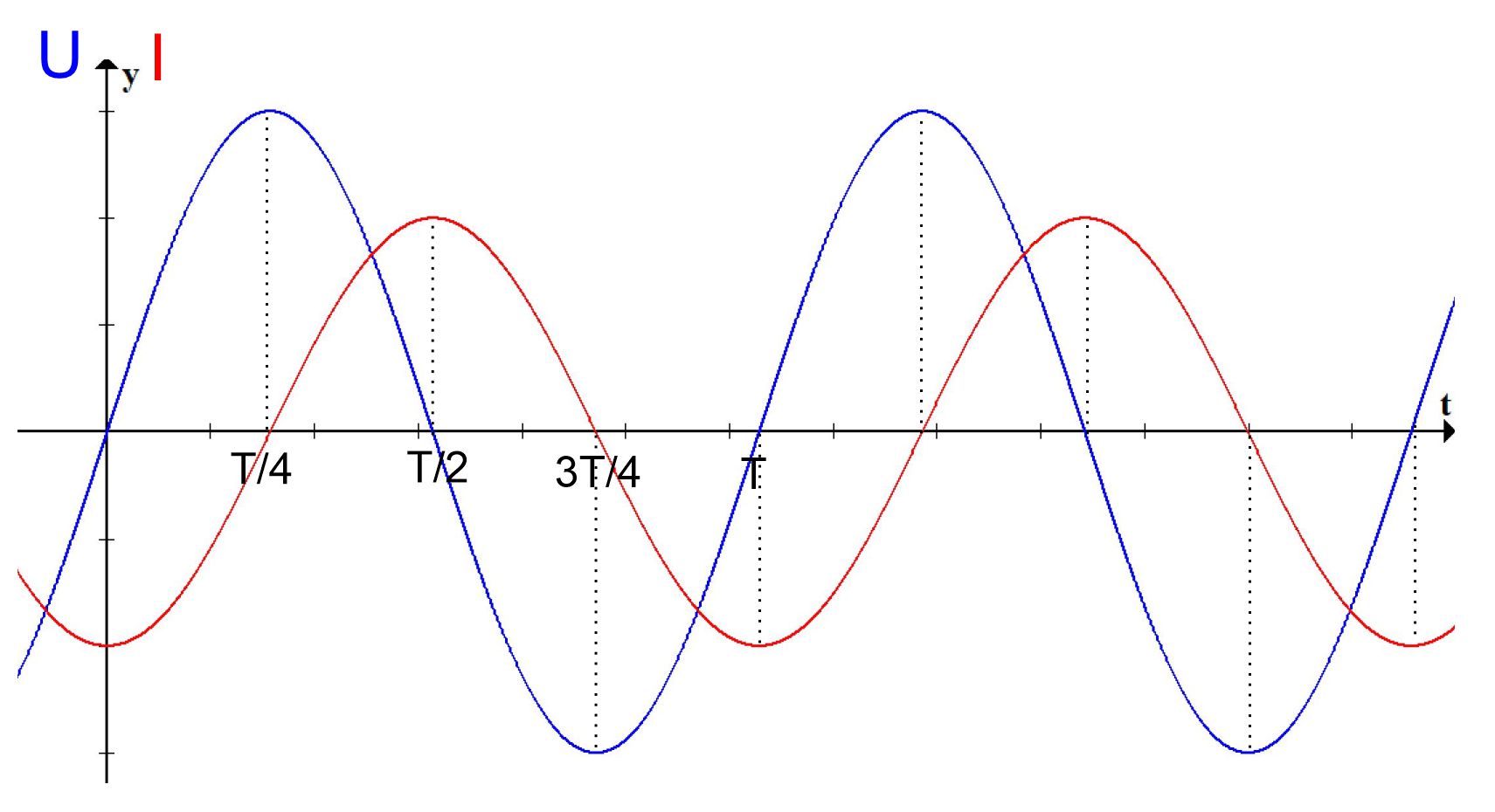 Generatorspannung (blau) und der In- duktionsspannung. T/4: Stromstärke ändert sich besonders stark →