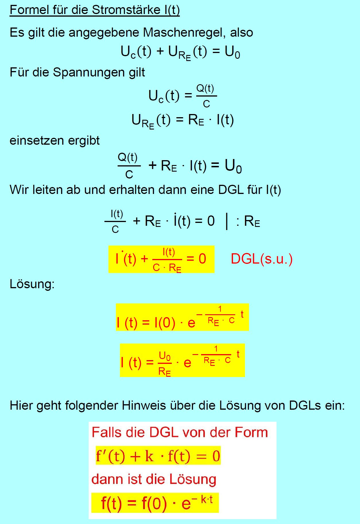 ) = Spannung am gesamten ohmschen Widerstand RE ; RE = R + Ri UC ( t ) = Spannung am Kondensator Zur Kontrolle: